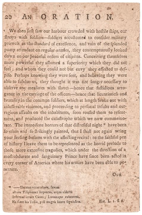 March 5, 1779-Dated Revolutionary War Period, Printed Pamphlet titled, “An Oration Delivered.... to Commemorate the Bloody Tragedy of the Fifth of March, 1770,” (The Boston Massacre), Boston: Printed by Edes & Gill, in Court-Street, Very Fine.