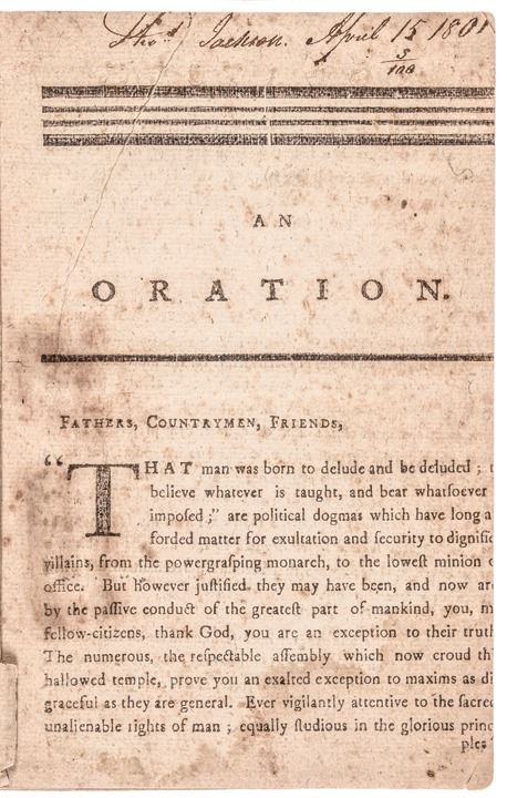 This very rare Revolutionary War Printed Pamphlet is titled: “An Oration, delivered March 5th, 1779, at the Request of the Inhabitants of the Town of Boston; to Commemorate the Bloody Tragedy of the Fifth of March, 1770, By William Tudor, Esquire,” with 18 pages, measures 5.25” x 8” at, “Boston: Printed by Edes & Gill, in Court-Street. M.DCC.LXXIX.” Signed atop the first page of the oration, “Thos Jackson April 15 1801.” Some pages closely trimmed affecting the last letter of some lines, some soiling and minor ink smudge on the cover and foxing, pages are tied together with its original thread stitching. Some passages are underlined and there are cross-outs and corrections. For example, in the phrase: “Cromwell granted their request – and became sole tyrant of three kingdoms,” Jackson, most probably, crossed out “kingdoms,” replacing it with “countries.” Referring to Sweden’s King Gustavus III, Tudor calls him “so wise, so good a King.” “King” is crossed out and replaced with “Man.” The back page is numbered “20” and the word “Our” appears at the bottom right indicating that at least a twenty-first page beginning with “Our” is missing.