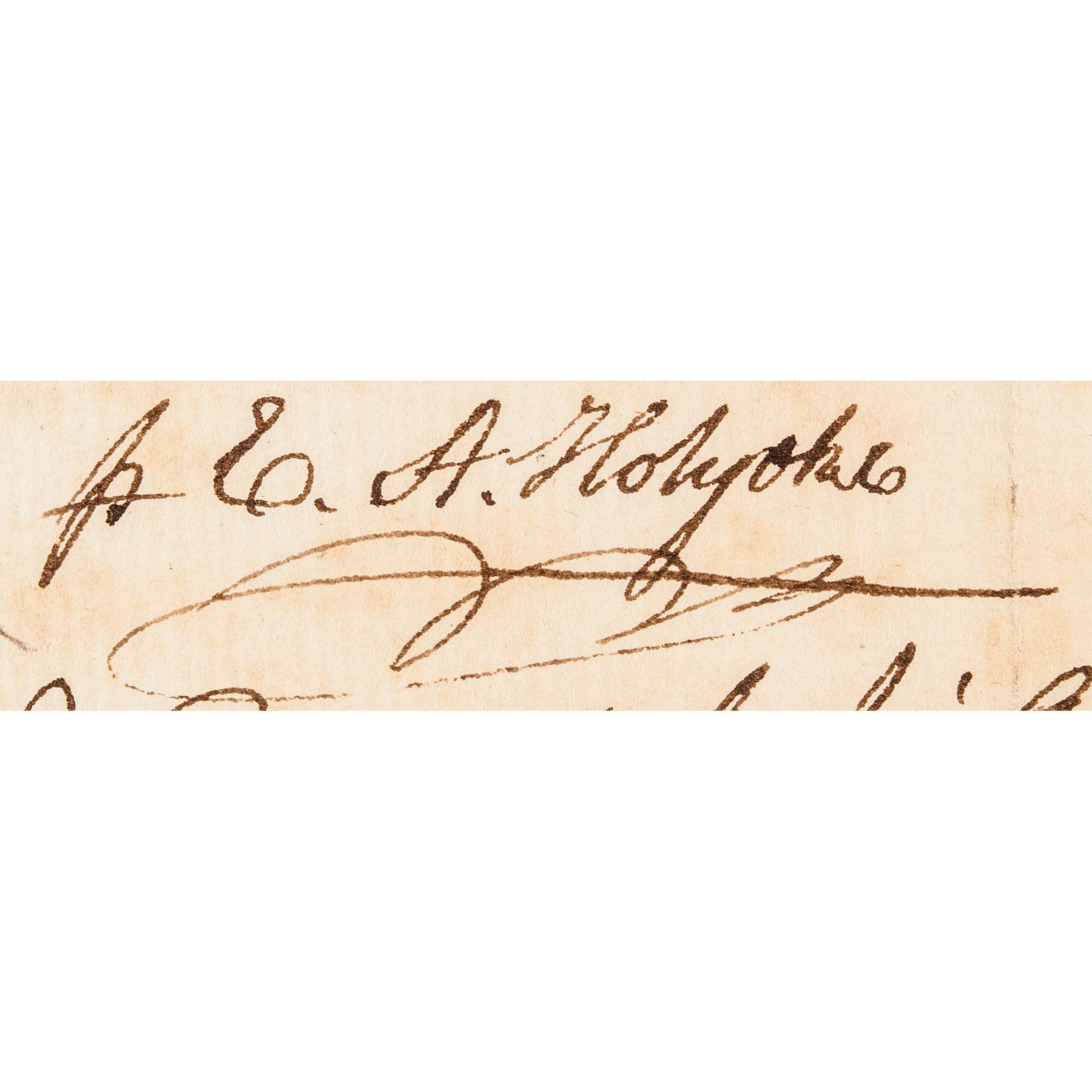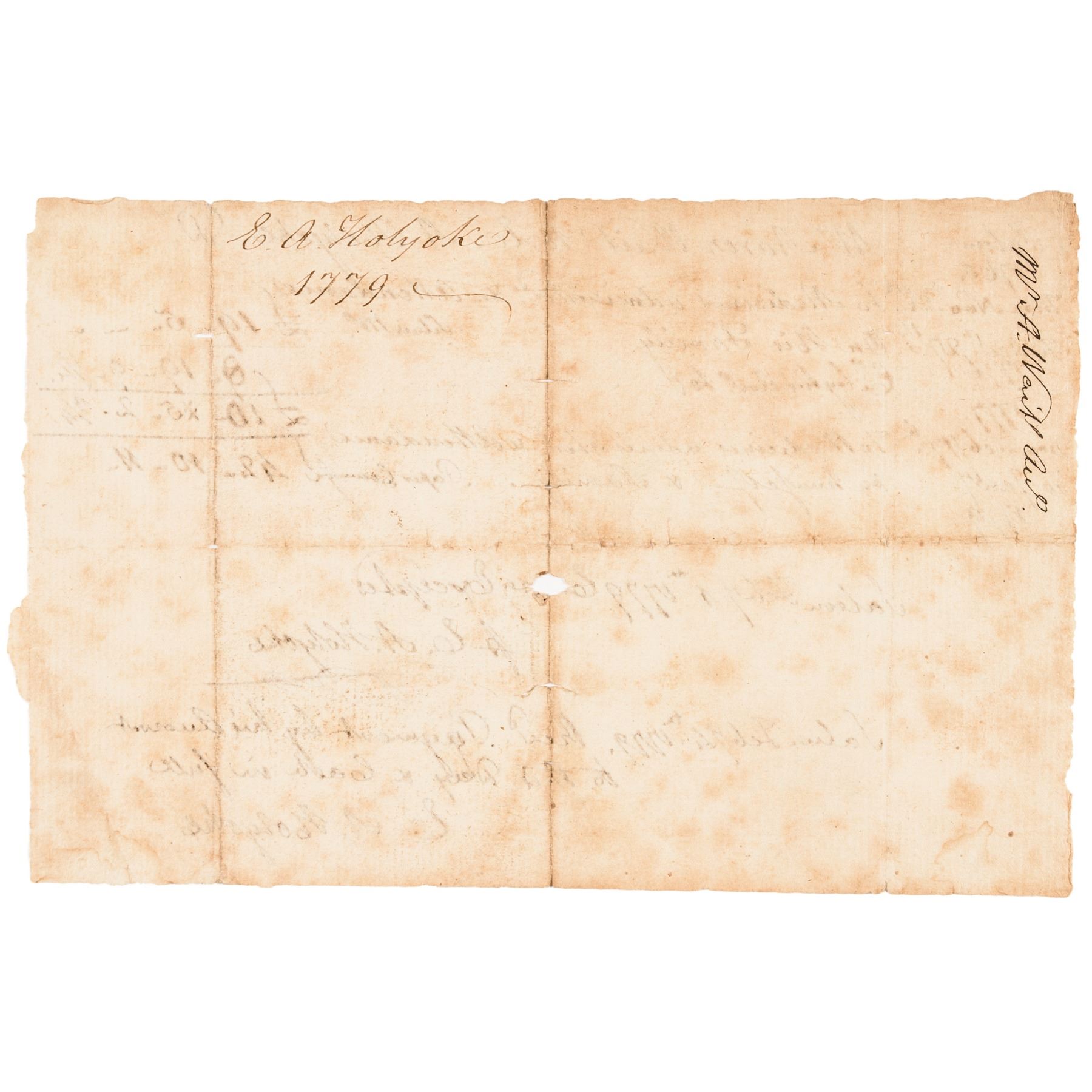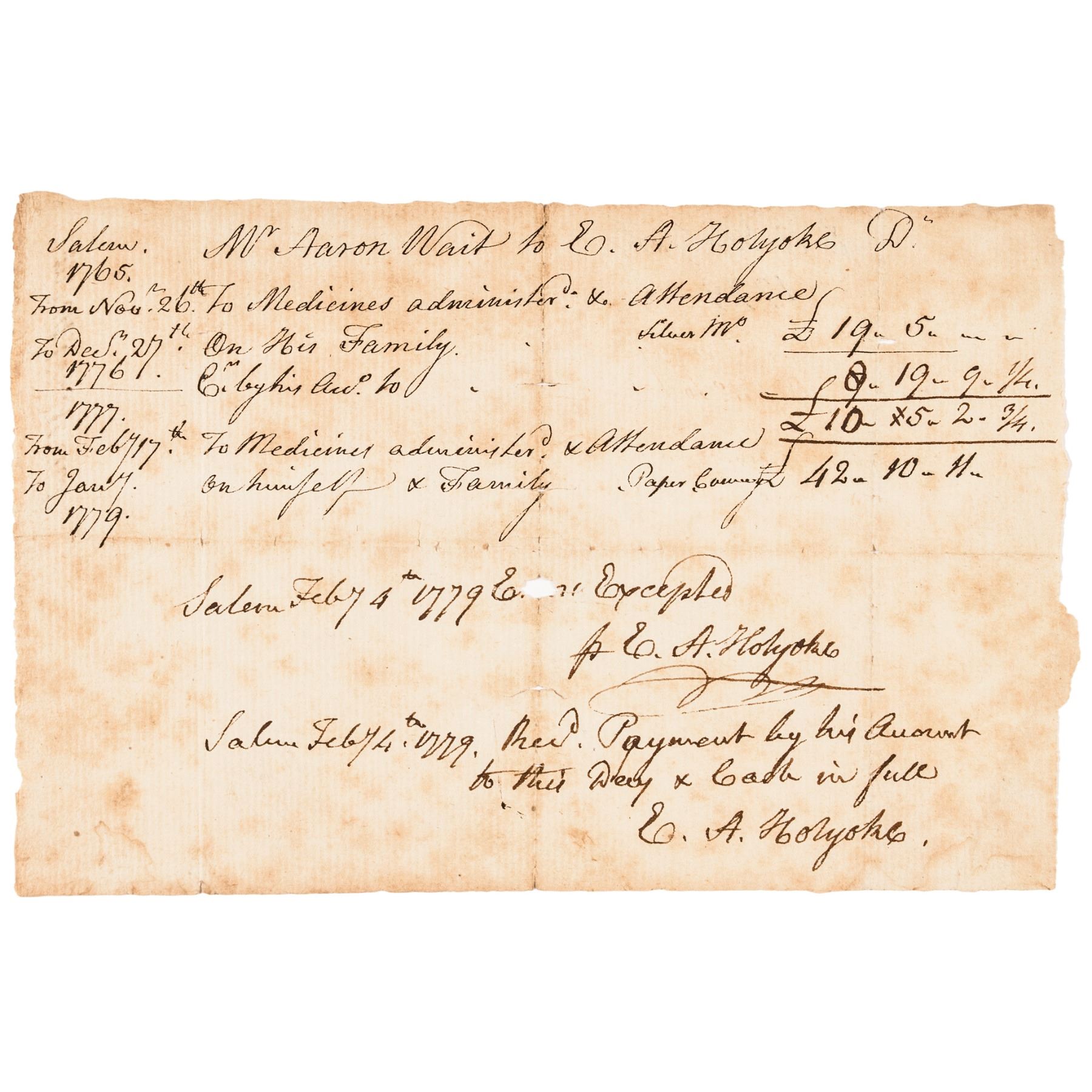 February 4, 1779-Dated, Manuscript Document Twice Signed, , measuring about 5” x 8”, 1 page, Salem, (MA), Fine. Being a Medical Bill Receipt from, “Mr Aaron Wait to E.A. Holyoke Dr.” It appears that this invoicing and bill ran from November 1765 until January 1779. Dr. Holyoke treated and charged Wait and his family for “Medicines administered & Attendance”. Text at bottom in Holyoke’s hand reads, “Salem - Feby 4th 1779 Recd Payment by his Account to this Debt & Cash in full”. Folds, small fold intersection hole at center with expected slight tone, boldly written in deep brown ink on period laid paper. A nice example signed by Edward Holyoke as a Physician, and best known for his work during the Smallpox epidemic.