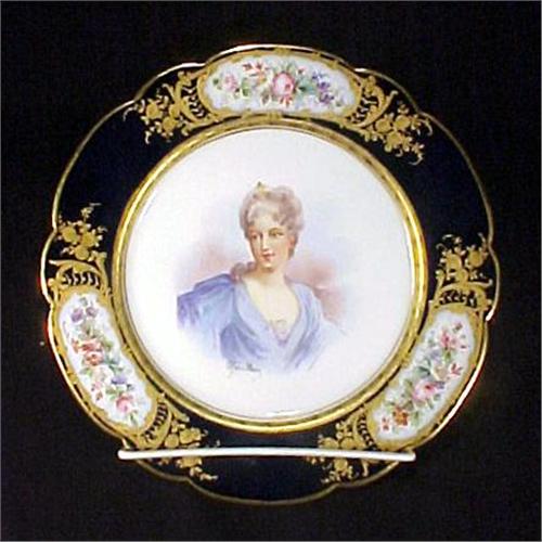 This is a rare and exceptional example of the world?s finest porcelain ? Sevres. This plate dates from 1779 ? its hand painted with the portrait of Madam de Bourgogne. It is artist signed - Gaultier. It has a paper label on the back ? which is very interesting ? it is from the Hill Street Galleries, Athens, Georgia. It is a very old label. The edges of the plate is in deep rich cobalt blue with three reserves of enameled flowers surrounded by gold gilt decorations. The interior rim of the plate also has a lavish amount in the gild gilded border. The plate is in very fine condition ? no scratches, no chips. This plate is from a very fine estate in Bangor, Maine. It is a rare and exceptional example. It is a very fine cabinet plate and quite the collectible item. It measures 8 5/8? in diameter.