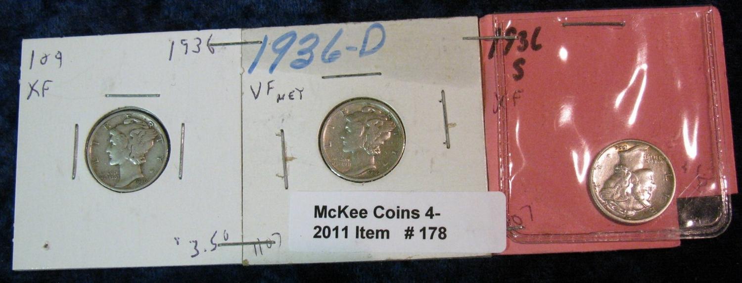 178. 1936 P, D, & S Mercury Dime. VF-EF.