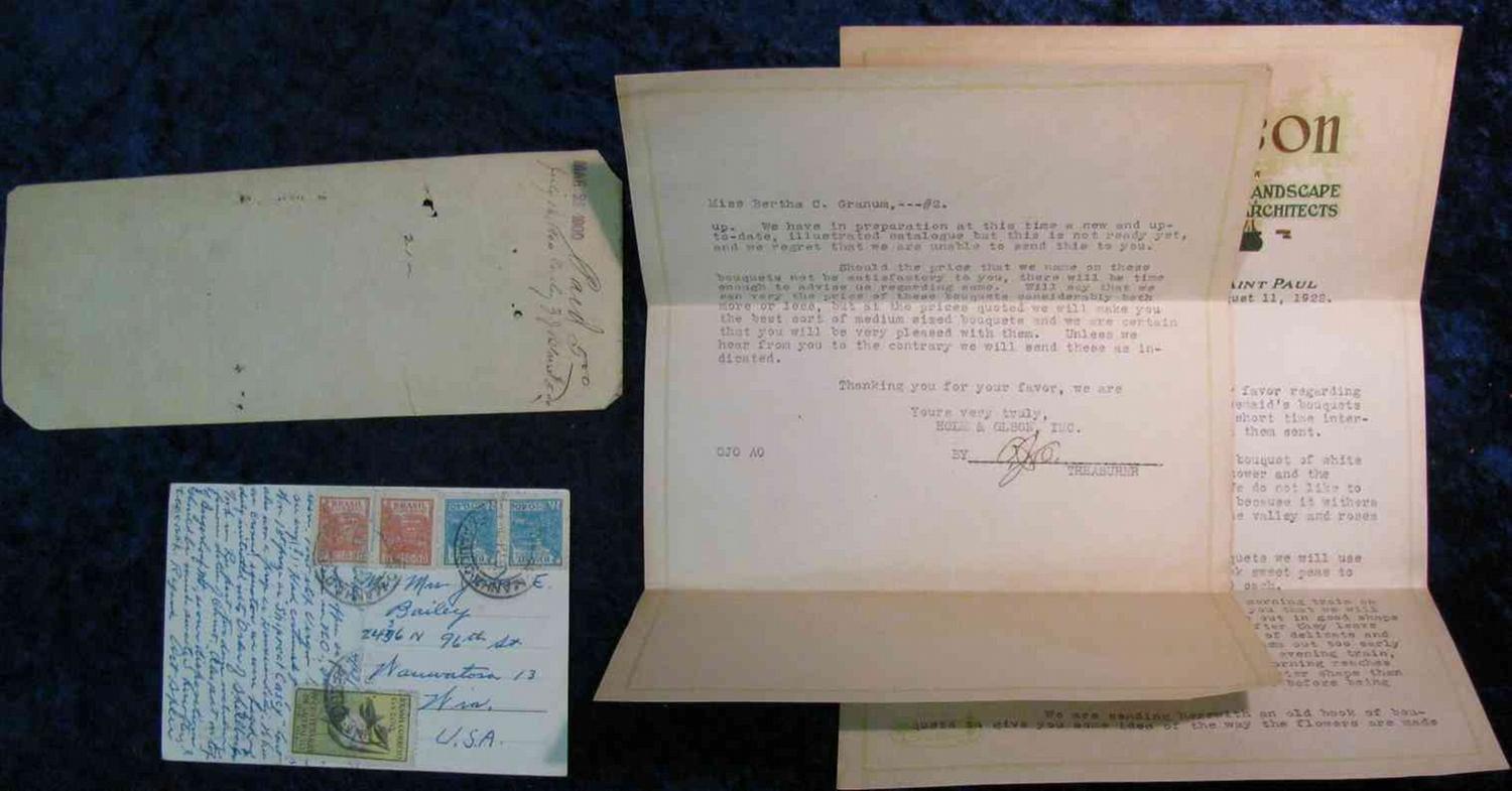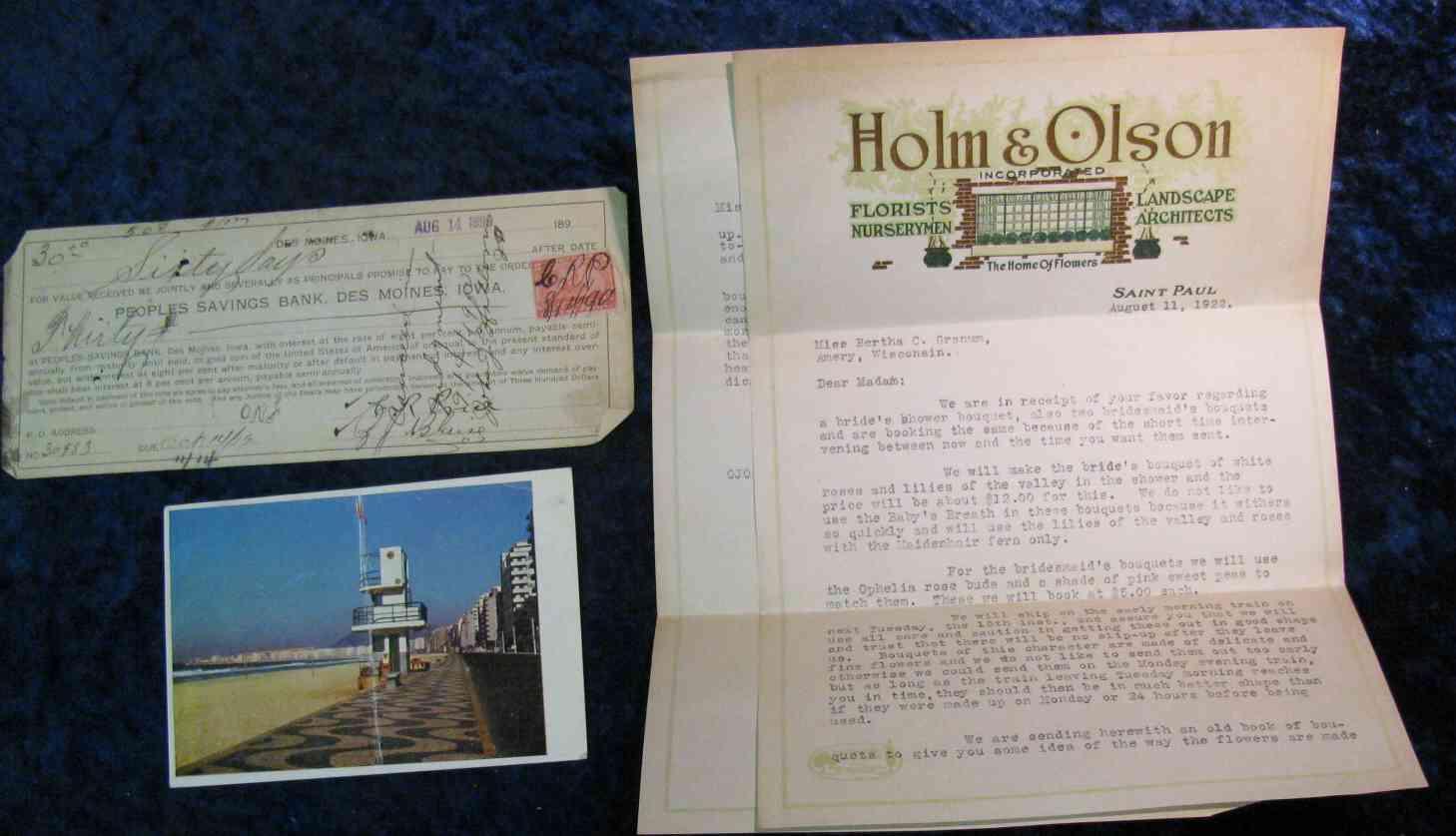 178. 1954 Era Brazil Post Card with (5) Stamps discusses crossing equator and more; 1922 Holm & Olson Florists & Landscape Architects letterhead with correspondence on bridal flowers'; & 1899 People's Savings Bank, Des Moines, Ia. Promissory Note with 2c Documentary Stamp.