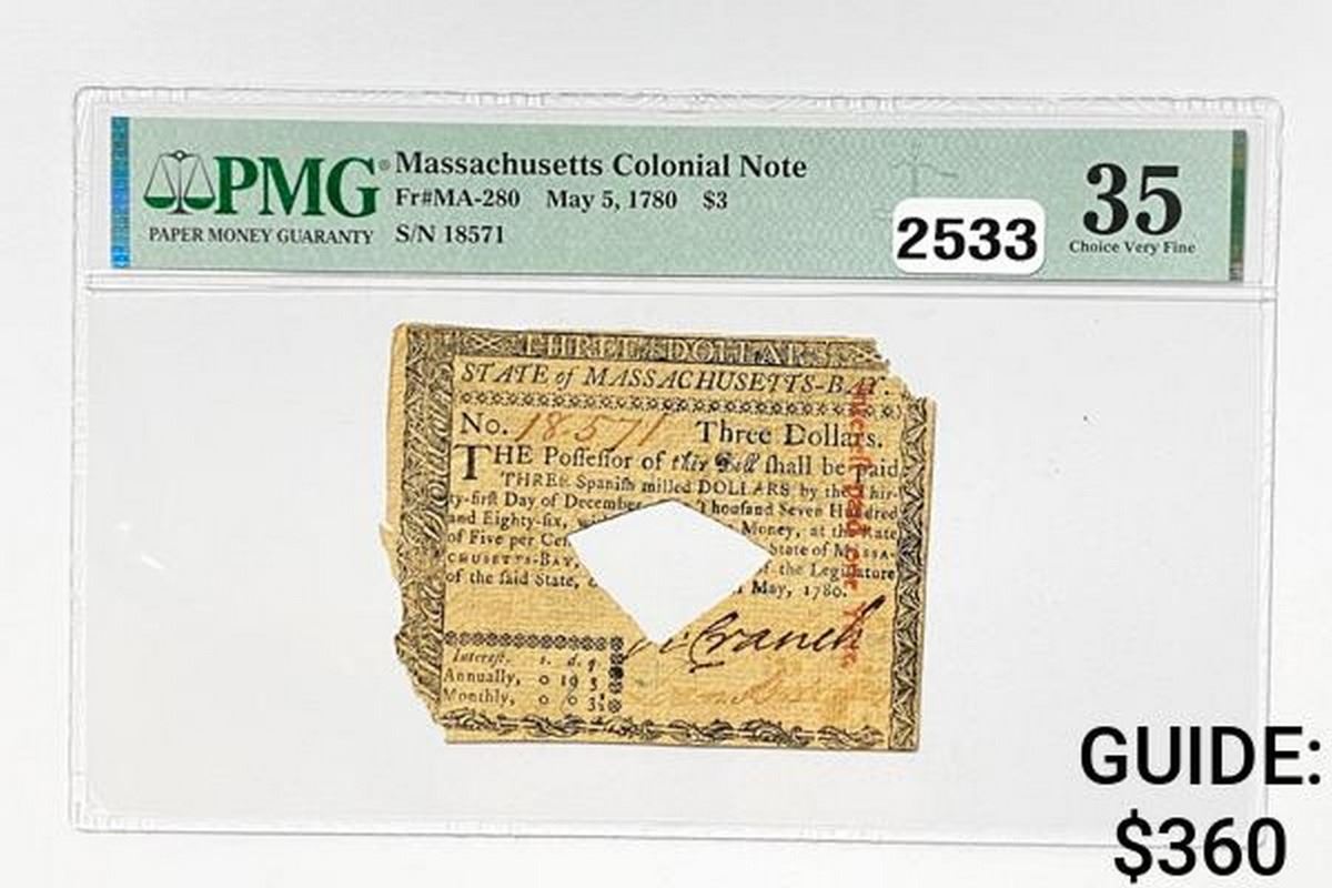 1780 $3 Massachusetts Colonial Note PMG 35 VF+