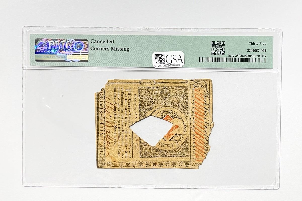 f. Notes sold referencing a third-party grading service are sold “AS IS” without any express or implied warranty, except for guarantee by GSA that they are genuine. Grading, condition or other attributes of any Product may have a material effect on its value and the opinion of others, including third-party grading services such as PCGS Currency and PMG may differ with that of GSA. GSA shall not be bound by any prior or subsequent opinion, determination, or certification by any grading service. Bidders specifically waive any claim to right of return of any Product because of the opinion, determination, or certification, or lack thereof, by any grading service. Certain warranties may be available from the grading services and Bidders are referred to them for further details: Paper Money Guaranty (PMG), PO Box 4711, Sarasota, FL 34230; PCGS Currency, PO Box 10470, Peoria, IL 61612-0470; PCGS Gold Shield, PO Box 9458, Newport Beach, CA 92658. Third-party graded notes are not returnable for any reason whatsoever.
