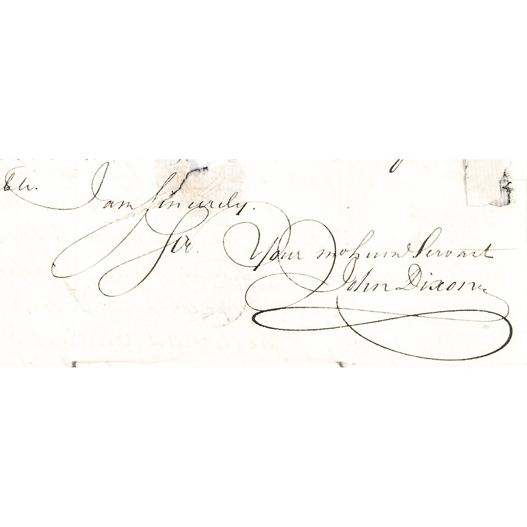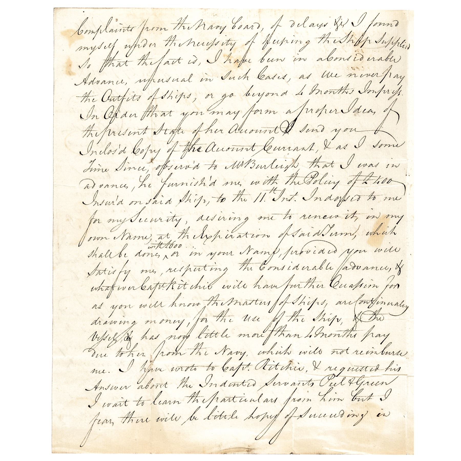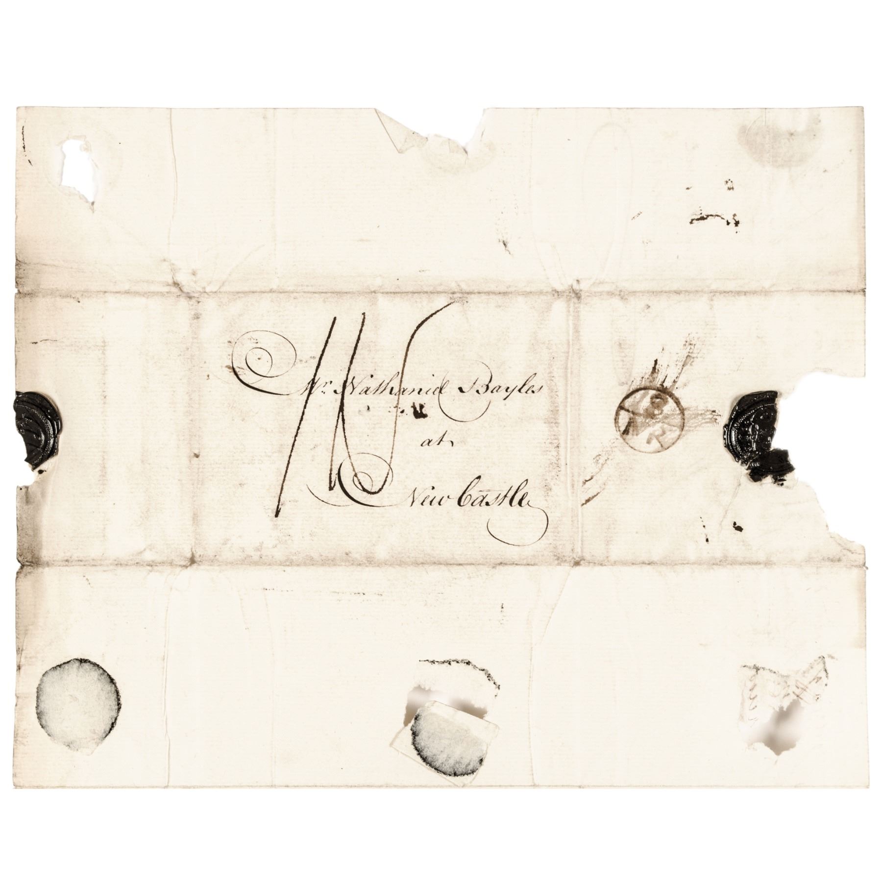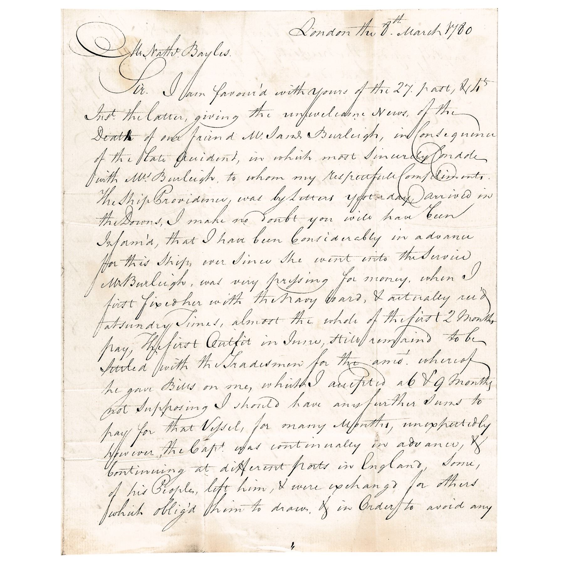 Original Autograph Letter, 3 pages, with Integral Mailing Cover, measuring 7.25” x 9”, written by John Dixon to Nathaniel Bayles, regarding the outfitting of the ship H.M.S. Providence for the Navy under Captain Ritchie. Dixon writes that he needs money to keep outfitting the ship and to avoid complaints by the Navy Board. Dixon also states that there are two indentured servants aboard, but most likely won't be back as he has also lost several servants in the same manner. Paper loss to final page where the black wax seals were broken upon opening of this Letter affecting a few words. The National Archives has a grouping of letters from the Ship Providence showing that the Providence was also a Slave ship. Title of the archive in the British National Archives is as follows: “John Ritchie, Captain of ship Providence: corresp to Nathaniel Bayles of Newcastle while sailing between New York and Jamaica, voyage accounts, crew wages lists, Slave cargoes and the Providence's involvement in the American War of Independence 1780-1782."