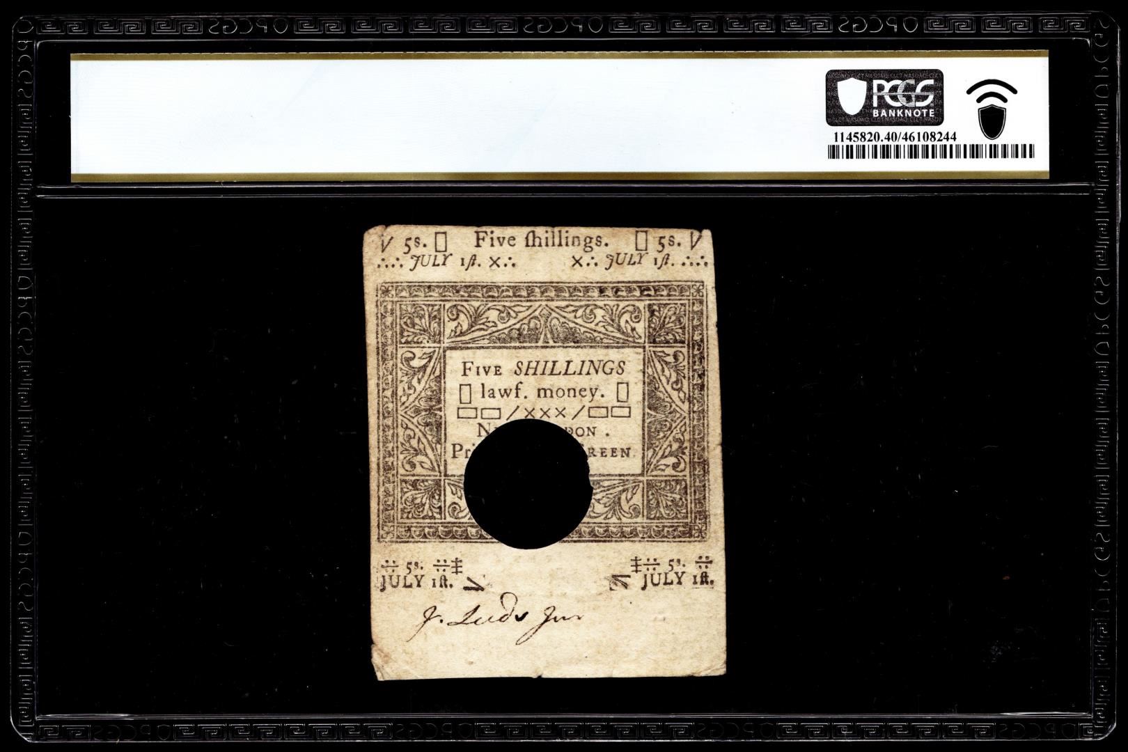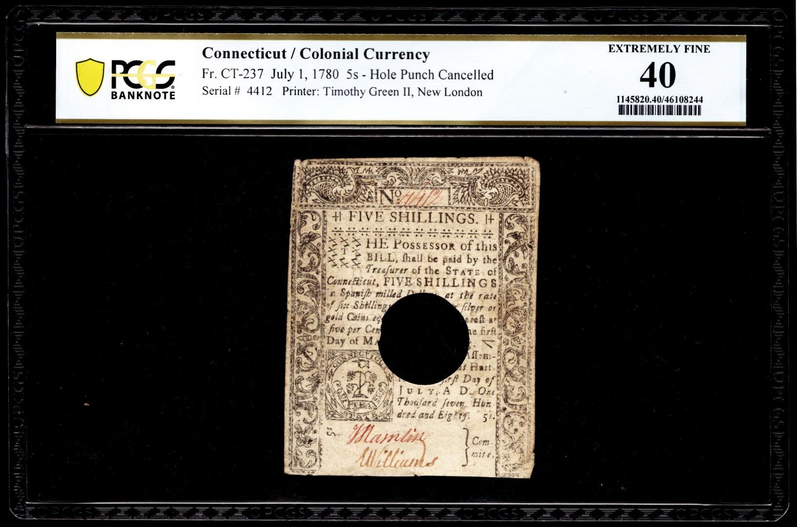 One 1780 Connecticut 5 Shillings Colonial Currency Note Fr. CT-237 PCGS Extremely Fine 40. PCGS Graded.