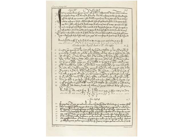1780. LIBRO: (PALEOGRAFIA). MERINO, ANDRES: ESCUELA DE LEER LETRAS CURSIVAS ANTIGUAS Y MODERNAS, DESDE LA ENTRADA DE LOS GODOS EN ESPAÑA, HASTA NUESTROS TIEMPOS. Madrid: Gravadas las letras por Don Francisco Asensio y Mejorada, 1780. Folio. 36 p. + 443 p. Grandes viñetas grabadas al cobre y cul-de-lampe. 59 láminas. Enc. de época algo rozada en plena piel. Tejuelo. Nervios. Lomo cuajado. Pequeña mancha en el borde superior de las 2 primeras h. y falta en la parte central de la lámina 58.
