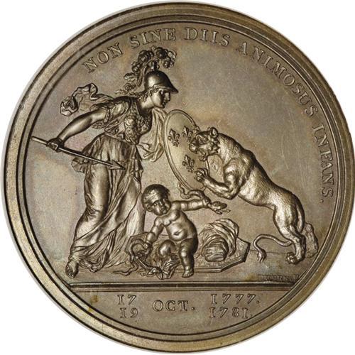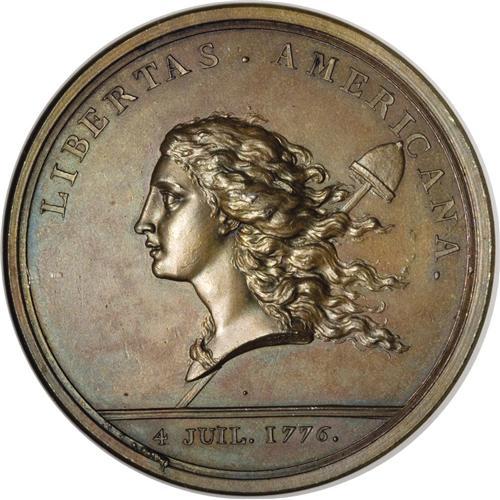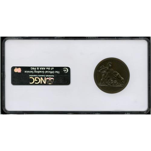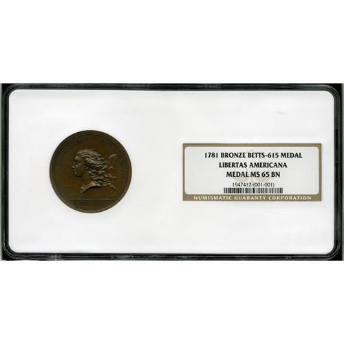 <B>1781 MEDAL Libertas Americana Medal MS65 Brown NGC.</B></I> Betts-615. Bronze. This historic Libertas Americana medal, commissioned by Benjamin Franklin and produced by the Paris Mint in France. The portrait of Liberty, with her free-flowing curls and a Liberty cap atop a pole behind her shoulder, had an obvious influence on the half cents of 1793 to 1797, and the cents of 1793 to 1796. The reverse of the medal depicts the infant America, protected by an Amazon-like France from the aggressive British lion. America is strangling two snakes, which represent the battles of Yorktown and Saratoga, important American victories whose dates appear on the exergue. Diagnostic obverse die lumps near 3 and 7 o'clock are characteristic of this scarce and coveted medal. A fully struck and satiny chocolate-brown piece with a solitary faded mark noted near the bust tip.<BR><BR><b>Shipping:</b> Coins & Currency (<a target="_blank" href="http://www.heritageauctions.com/common/shipping.php">view shipping information</a>)