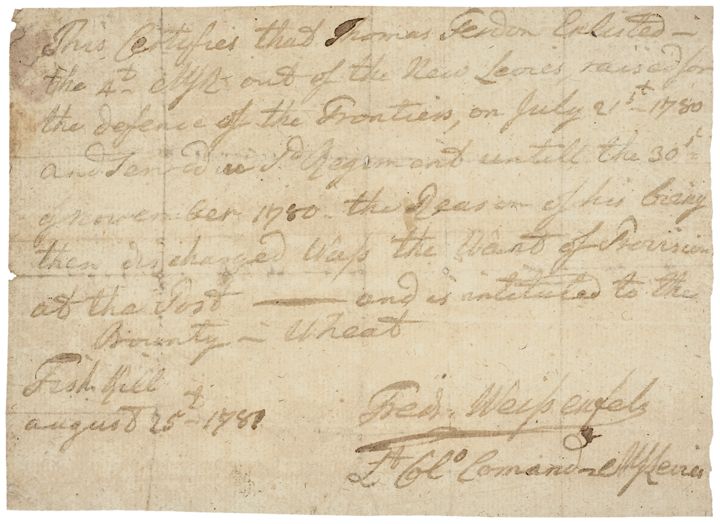 “This Certifies that Thomas Ferdon Enlisted in the 4th NYR out of the New Levies raised for the defence of the Frontiers, on July 21st 1780 and served in s(ai)d Regiment until the 30th of November 1780. the Reason of his being then discharged was the Want of Provisions at that Post --- and is intitled to the Bounty Wheat. ---- Fishkill August 25th-1781 - (Signed) Frederick Weisenfels, Lt. Col Commanding”.
