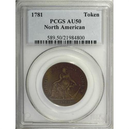 <B>1781 TOKEN North American Token AU50 PCGS.</B></I> Breen-1144. A lovely chocolate-brown example that has uncommonly smooth and pleasing surfaces. Although given a relatively humble AU50 grade by PCGS, the fields exhibit numerous criss-cross die polish lines, which suggests that the piece has only brief highpoint wear, suggested by a lighter color on the hands and face of Liberty. Listed on page 69 of the 2008 <I>Guide Book.<BR>Ex: Oak Collection of American Colonial Coinage (Heritage, 9/05), lot 374.</B></I><BR><BR><b>Shipping:</b> Coins & Currency (<a target="_blank" href="http://www.heritageauctions.com/common/shipping.php">view shipping information</a>)