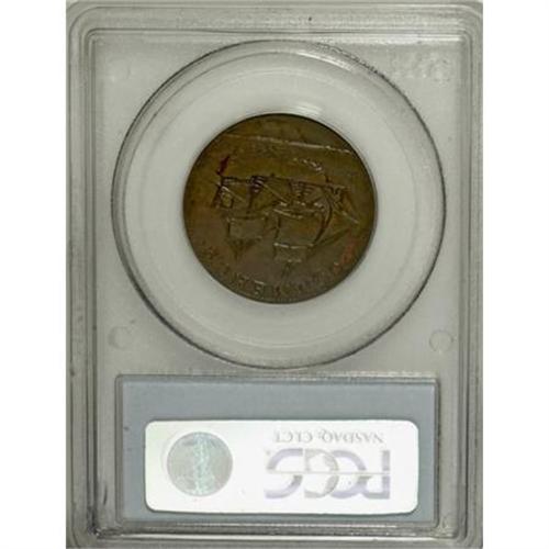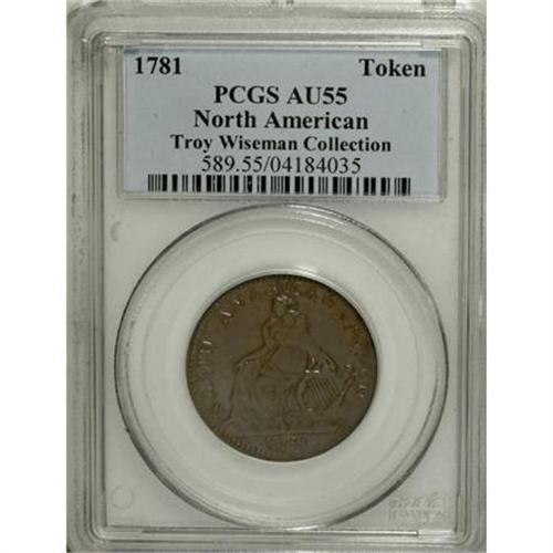 <B>1781 TOKEN North American Token AU55 PCGS.</B></I> Breen-1144. This Dublin copper issue was exported to North America, the same journey undertaken by St. Patrick farthings more than a century prior. A lovely chocolate-brown piece with considerable shimmer and occasional mint-made laminations. Minor friction is noted on the face and sails, and a few virtually invisible hairlines are seen on the lower reverse. Listed on page 69 of the 2008 <I>Guide Book.</B></I> Population: 5 in 55, 3 finer (9/07).<BR><I>Ex: Troy Wiseman Collection, Part Two (Heritage, 1/07), lot 205.</B></I><BR><BR><b>Shipping:</b> Coins & Currency (<a target="_blank" href="http://www.heritageauctions.com/common/shipping.php">view shipping information</a>)