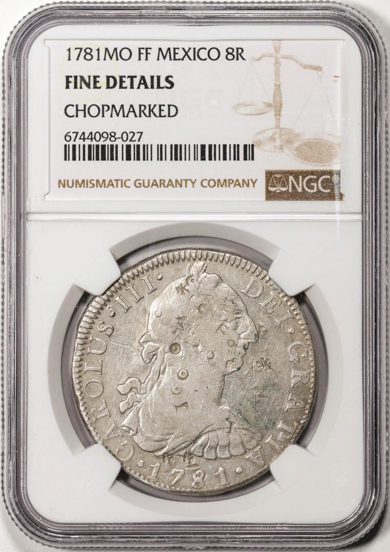 One 1781MO FF Mexico 8 Reales Silver Coin NGC Fine Details Chopmarked. NGC Certified.