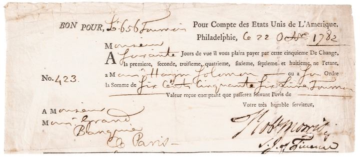 HAYM SALOMAN (1740-1785) and ROBERT MORRIS (1734-1806) Signed 1782 Fifth Bill of Exchange in French, Payable in Paris Anderson-Smythe US-119