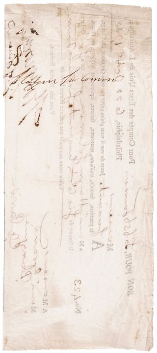 The first of this remarkable United States Bill of Exchange Form we have handled, and very rarely offered for sale, included in only most significant of collections. Printed on fine white paper that appears slightly translucent, being its full-size and untrimmed. This Partly-Printed Form is completely in French, yet issued from Philadelphia. It is fully accomplished, officially Signed and Countersigned. Hand-Dated “22 Oct. 1782” and issued for 656 Livres Tournois. Robert Morris is the authorized signature guaranteeing payment by the United States. Haym Salomon as the recipient, has Countersigned with his authorization on the reverse if necessary to receive payment.