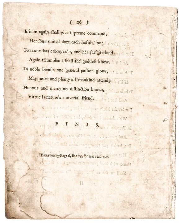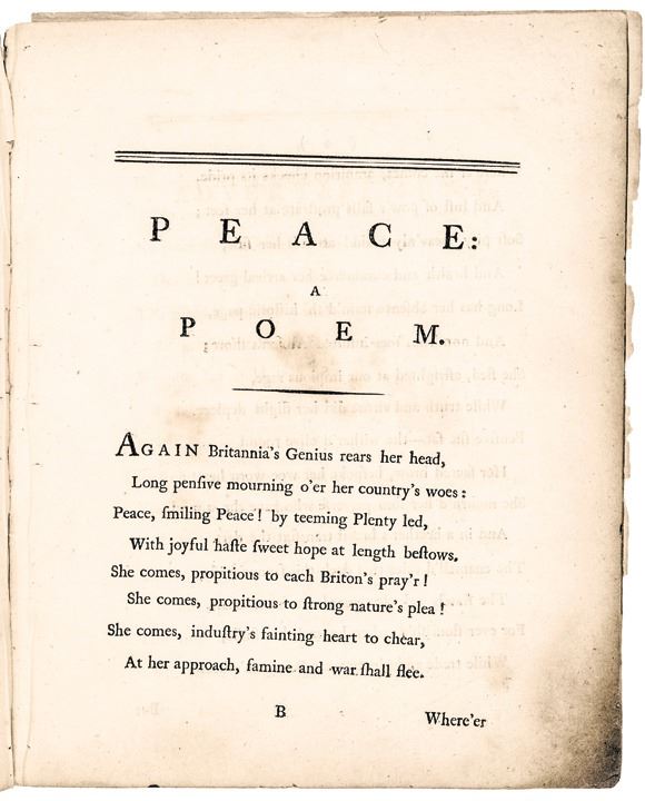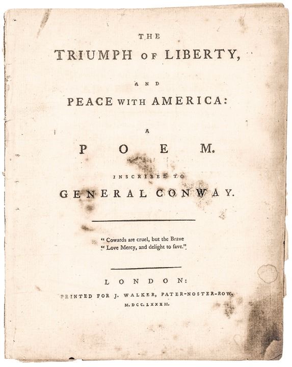 “The Triumph of Liberty, and Peace with America: A Poem Inscribed to General Conway.” (London: Printed for J. Walker, Pater-Noster-Row, 1782), 26 pages, octavo, measuring 8” x 10”, just lacking the half-title page. Some heavy tone at the lower right margin and bottom right corner, minor loss to first page at bottom right comer, minor binding remnants along left margin, mild dampstains, final page detached yet present.