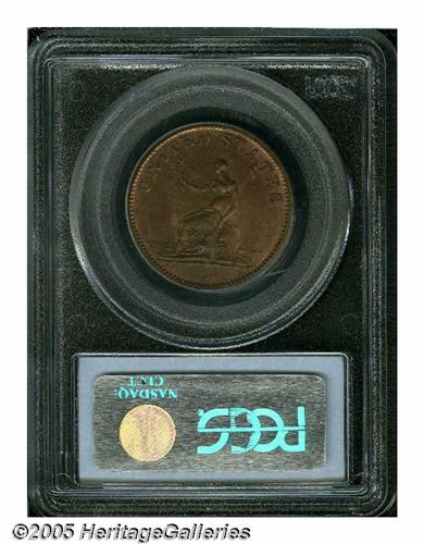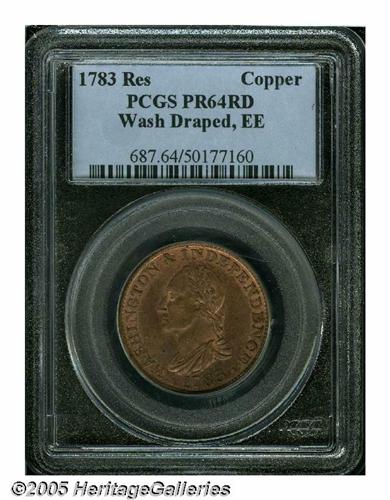 <B>1783<1C> Washington & Independence Cent, Draped Bust, Copper Restrike, Engrailed Edge PR64 Red PCGS.</B></I> Baker-3. A boldly struck brick-red near-Gem. Free from contact, only a tiny toning fleck or two precludes a finer grade. A restrike made in the 1850s by Taylor in London, who acquired the hubs with scrap from the Soho mint and from them made working dies. Listed on page 65 of the 2005 <I>Guide Book.</B></I>