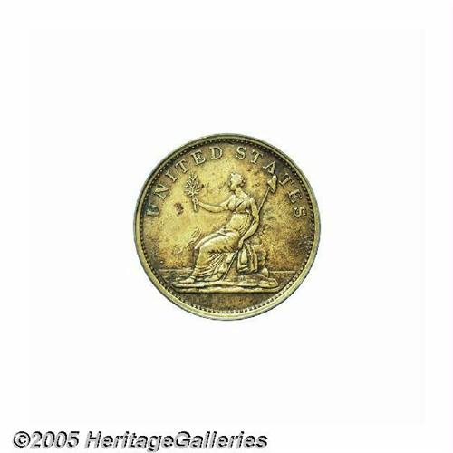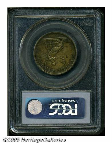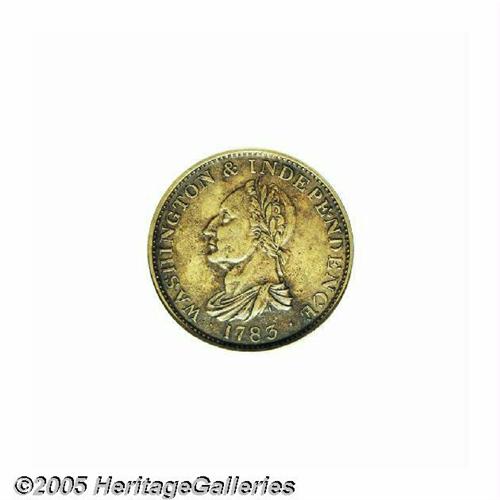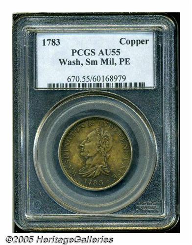 <B>1783<1C> Washington & Independence Cent, Draped Bust, No Button AU55 PCGS.</B></I> Breen-1191, described by Walter Breen as "Soho restrike, small date. Brass. Plain edge. 2 known." Alternatively, this is described by PCGS as "Copper. Wash, Sm Mil, PE" (Washington, Small Military Bust, Plain edge, Copper).<BR> A rare variant of the familiar Baker-2 design, struck in brass instead of the usual copper, according to Breen. This is the <B>Breen plate coin,</B></I> listed as example 1, struck from "heavily clashed and rusted original dies." The clash marks (as made), from the profile and hair braid, outline the lower half of the seated effigy on the reverse. Three short, parallel die scratches are on the reverse border near 3 o'clock, across a small section of die rust; these possibly represent an attempt to reduce the effects of the die rust on the struck coins. The brassy light brown color darkens near the borders with a few deeper splashes of color in the fields. An old diagonal scratch across the chest of the seated figure does not distract. A rare and unusual piece for the Washingtonia specialist. The following pedigree is from the Breen <I>Complete Encyclopedia.</B></I><BR><I>Ex: T. James Clarke, (NASCA, 6/78), lot 3612; Jonathan Kern; Daniel Presburger.</B></I>