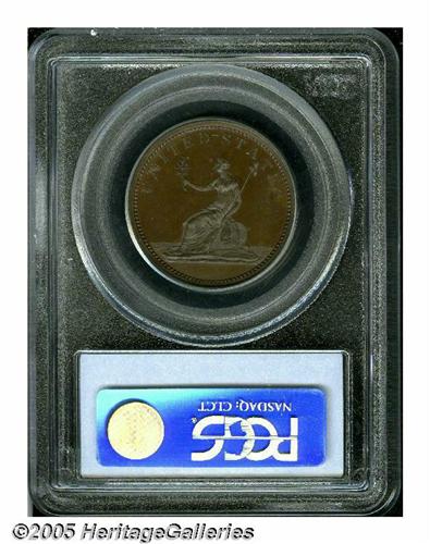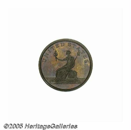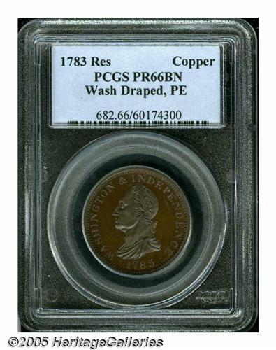 <B>1783<1C> Washington & Independence Cent, Draped Bust, Copper Restrike, Plain Edge PR66 Brown PCGS.</B></I> Baker-3, R.1. A high grade example of this popular Washington restrike. Powder-blue and plum colors appear when the obverse is rotated beneath a light, while rose, powder-blue, and olive-gold hues embrace the reverse. This sharply struck premium Gem shows little evidence of handling. A few freckles of die rust are as made. British coin dealer W. J. Taylor struck this issue in the mid 19th century. Population: 3 in 66, 1 finer (6/05).