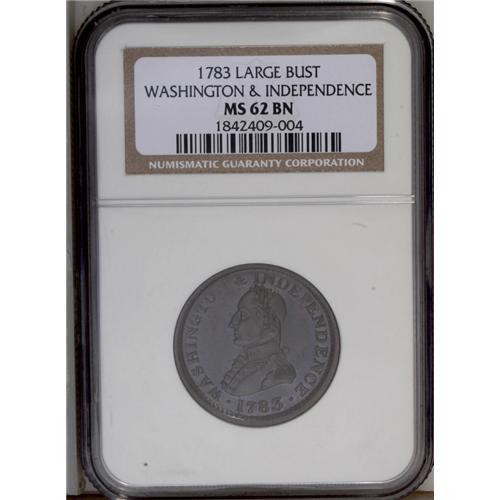 <B>1783<1C> Washington & Independence Cent, Large Military Bust MS62 Brown NGC.</B></I> Baker-4, R.1. A fully lustrous and well preserved example of this popular type. Although Baker-4 is not a rarity, Uncirculated pieces are surprisingly difficult to find. A well struck and unmarked example. Listed on page 75 of the 2007 <I>Guide Book.</B></I>
