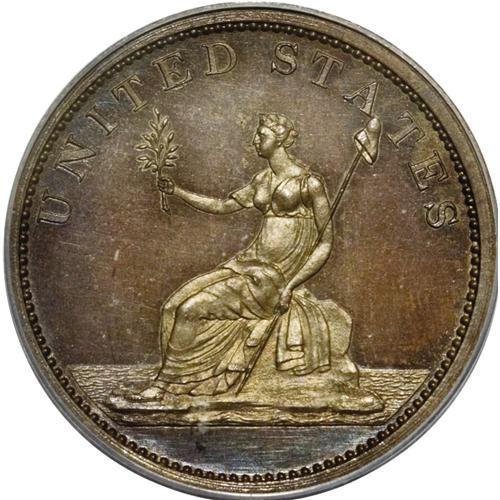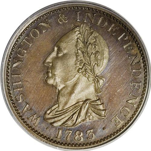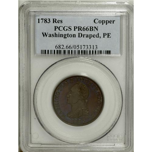<B>1783 1C Washington & Independence Cent, Draped Bust, Copper Restrike, Plain Edge PR66 Brown PCGS.</B></I> Baker-3C. The scarce Small Letters, Plain Edge restrike variety, struck from a different set of dies than the more often encountered Engrailed Edge, Large Letters restrike. The iridescent electric-blue and plum-red fields are beautiful to behold. As of (10/06), PCGS has certified only 22 Plain Edge, compared to 112 Engrailed Edge pieces. Listed on page 76 of the 2007 <I>Guide Book.</B></I><BR><BR><b>Shipping:</b> Coin/Currency (<a target="_blank" href="http://www.heritageauctions.com/common/shipping.php">view shipping information</a>)