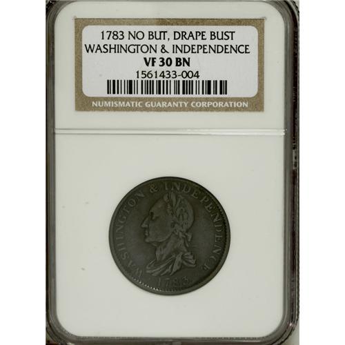 <B>1783 1C Washington & Independence Cent, Draped Bust, No Button VF30 NGC.</B></I> NGC Census: (0/0). PCGS Population (7/86). (#676)<BR><BR><b>Shipping:</b> Coins & Currency (<a target="_blank" href="http://www.heritageauctions.com/common/shipping.php">view shipping information</a>)