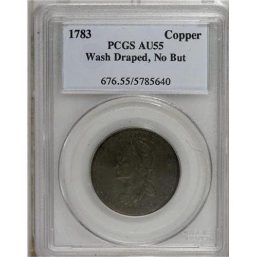 <B>1783 1C Washington & Independence Cent, Draped Bust, No Button AU55 PCGS.</B></I> Baker-2, R.1. Light but distinct wear is present on Washington's ear and the highpoints of Liberty. Well-defined with minor elements of dusky orange that enliven the otherwise walnut-brown surfaces. Listed on page 76 of the 2008 <I>Guide Book</B></I>.<BR><BR><b>Shipping:</b> Coins & Currency (<a target="_blank" href="http://www.heritageauctions.com/common/shipping.php">view shipping information</a>)