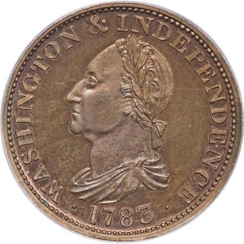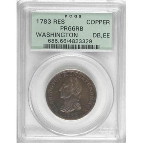 <B>1783 1C Washington & Independence Cent, Draped Bust, Copper Restrike, Engrailed Edge PR66 Red and Brown PCGS.</B></I> Baker-3. Gorgeously toned in cherry-red, sun-gold, and apple-green shades. This exquisitely preserved and well made Premium Gem will delight even the veteran collector of Washingtonia. Housed in a green label holder. Listed on page 76 of the 2008 <I>Guide Book.</B></I> Population: 5 in 66 Red and Brown, 1 finer (8/07).<BR><BR><b>Shipping:</b> Coins & Currency (<a target="_blank" href="http://www.heritageauctions.com/common/shipping.php">view shipping information</a>)