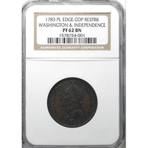 <B>1783 1C Washington & Independence Cent, Draped Bust, Copper Restrike, Plain Edge PR62 Brown NGC.</B></I> Baker-3C. The Taylor restrike with a Small 3 in the date, which distinguishes it from the similarly well-made W.S. Lincoln restrike (Baker-3). This is an intricately struck dark brown Washington piece with a subtle fingerprint on the left obverse field, a whisper of gray verdigris, and a few tiny field pits. Listed on page 76 of the 2008 <I>Guide Book</B></I>.<BR><I>From The Liberty Collection of United States Colonial Coinage.</B></I><BR><BR><b>Shipping:</b> Coins & Currency (<a target="_blank" href="http://www.heritageauctions.com/common/shipping.php">view shipping information</a>)
