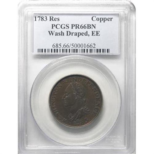 <B>1783 1C Washington & Independence Cent, Draped Bust, Copper Restrike, Engrailed Edge PR66 Brown PCGS.</B></I> Large 3. Baker-3. This pinpoint-sharp Premium Gem is bathed in rich golden-brown and sea-green shades. The smooth fields are void of marks, and carbon is minimal. Listed on page 76 of the 2008 <I>Guide Book</B></I>. Population: 9 in 66 Brown, 4 finer (12/07).<BR><I>From The Liberty Collection of United States Colonial Coinage.</B></I><BR><BR><b>Shipping:</b> Coins & Currency (<a target="_blank" href="http://www.heritageauctions.com/common/shipping.php">view shipping information</a>)