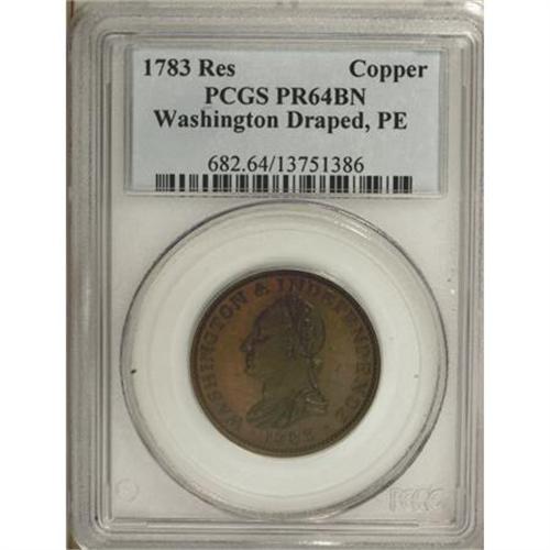 <B>1783 1C Washington & Independence Cent, Draped Bust, Copper Restrike, Plain Edge PR64 Brown PCGS.</B></I> Baker-3C. Small 3. This exactingly struck near-Gem features lovely golden-brown fields and medium brown devices. Three short and unimportant lintmarks are of mint origin. Listed on page 76 of the 2008 <I>Guide Book.</B></I><BR><I>From The Liberty Collection of United States Colonial Coinage, Part Two.</B></I><BR><BR><b>Shipping:</b> Coins & Currency (<a target="_blank" href="http://www.heritageauctions.com/common/shipping.php">view shipping information</a>)