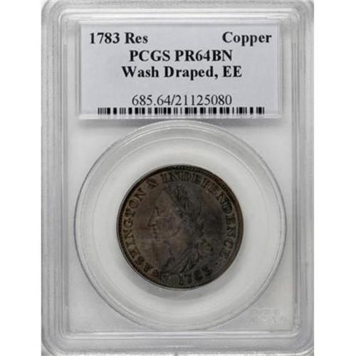 <B>1783 1C Washington & Independence Cent, Draped Bust, Copper Restrike, Engrailed Edge PR64 Brown PCGS.</B></I> Baker-3. This needle-sharp specimen is beautifully smooth and exhibits original almond-gold, lilac, and powder-blue toning. The reverse has an inconsequential brown freckle near 6 o'clock. Listed on page 76 of the 2008 <I>Guide Book</B></I>.<BR><BR><b>Shipping:</b> Coins & Currency (<a target="_blank" href="http://www.heritageauctions.com/common/shipping.php">view shipping information</a>)