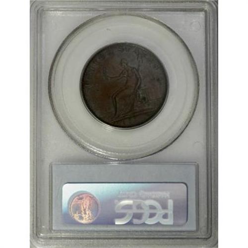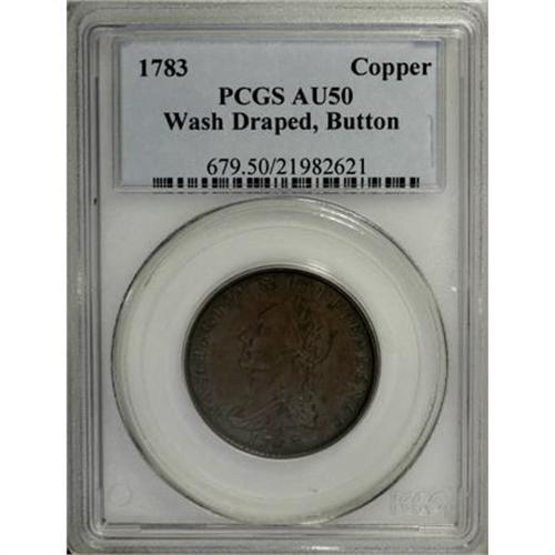 <B>1783 1C Washington & Independence Cent, Draped Bust, Button AU50 PCGS.</B></I> Baker-5, R.5. A lightly marked tan-brown piece. Hints of luster emerge from the borders and drapery. Much tougher to find than the similar No Button Baker-2 variety. Listed on page 76 of the 2008 <I>Guide Book.<BR>Ex: Oak Collection of American Colonial Coinage (Heritage, 9/05), lot 442, which realized $1,380.</B></I><BR><BR><b>Shipping:</b> Coins & Currency (<a target="_blank" href="http://www.heritageauctions.com/common/shipping.php">view shipping information</a>)