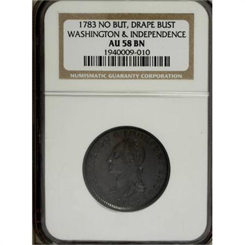<B>1783 1C Washington & Independence Cent, Draped Bust, No Button AU58 NGC.</B></I> Baker-2, R.1. The more available of the two prominent Washington & Independence varieties, offered here in near-Mint State. Deep walnut-brown surfaces show just a trace of friction and occasional violet overtones.<BR><BR><b>Shipping:</b> Coins & Currency (<a target="_blank" href="http://www.heritageauctions.com/common/shipping.php">view shipping information</a>)