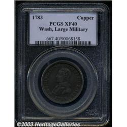 1783 1C Washington & Independence Cent, Large Military Bust XF40 PCGS. Baker-4. Breen-1203. A nicely detailed mahogany-brown Washington piece. The borders have a hint of verdigris, and a wispy slide mark or two is encountered in the field above Liberty's legs. Listed on page 58 of the 2003 Guide Book. Important notice: Heritage usually auctions material at the rate of 200-250 lots per hour. On some occasions eBay Live bid software or the Internet may not be able to keep up with the pace of the auction. We recommend placing a realistic absentee bid now as insurance to avoid disappointment. Occasionally the auctioneer may eliminate or reject an eBay Live bid, and the auctioneer may also reopen a lot after the close of the eBay live bidding (usually because we missed an audience bid), and may reject your bid even if it shows you as the winning bidder. By bidding via eBay Live, you agree that Heritage may award the lot to another bidder at its sole discretion under the circumstances described above or any other reasonable circumstances. Also please note that all Heritage lots purchased through eBay Live carry a 20% Buyer's Premium. Please make sure you read the Terms and Conditions before you bid.