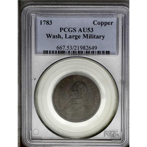 <B>1783<1C> Washington & Independence Cent, Large Military Bust AU53 PCGS.</B></I> Baker-4, R.1. Blended maroon and olive colors embrace this subdued and briefly circulated representative. A wedge-shaped die break from the 7 in the date to the W in WASHINGTON and the second button on the coat threatens the life of the die. Struck with medal turn, unlike most Baker-1 survivors. Listed on page 75 of the 2006 <I>Guide Book.</B></I> <BR><BR><B>Important notice:</B> Heritage usually auctions material at the rate of 200-250 lots per hour. On some occasions eBay Live bid software or the Internet may not be able to keep up with the pace of the auction. We recommend placing a realistic absentee bid now as insurance to avoid disappointment. Occasionally the auctioneer may eliminate or reject an eBay Live bid, and the auctioneer may also reopen a lot after the close of the eBay live bidding (usually because we missed an audience bid), and may reject your bid even if it shows you as the winning bidder. By bidding via eBay Live, you agree that Heritage may award the lot to another bidder at its sole discretion under the circumstances described above or any other reasonable circumstances. Since eBay bids are not shown to us until we open the lot on the floor, we treat those bids just like floor bids. In most cases the floor responds before the eBay bid is presented to us, due to Internet lag time, so for consistency we have made it a policy that floor bids are always considered first over tie eBay live bids. Also please note that all Heritage lots purchased through eBay Live carry a 20% Buyer's Premium. Please make sure you read the Terms and Conditions before you bid. This lot is being auctioned in conjunction with a live floor auction by Heritage Galleries & Auctioneers. All final auction and invoice information will be supplied by Heritage Galleries & Auctioneers, and all other information should be considered preliminary. Lot:188 <BR><BR><B>Winning Notification and Billing:</B> After the FINAL session in this auction is complete, Heritage will send e-mail and snail mail invoices. This process normally takes several days. All final auction and invoice information will be supplied by Heritage Galleries & Auctioneers, and all other information should be considered preliminary. <BR><BR>This auction will be conducted on a live auction floor and over the Internet through eBay Live. If you choose to place an absentee bid, please take a moment to <font color='#0000ff'><u><a href='http://pages.ebay.com/liveauctions/help/before/laabsentee.html'>learn how eBay Live absentee bidding works</a></u></font><font color='#000000'>