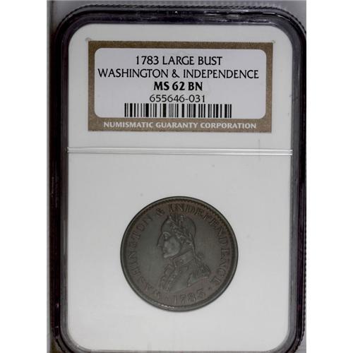 <B>1783<1C> Washington & Independence Cent, Large Military Bust MS62 Brown NGC.</B></I> Baker-4, R.1. Shimmering satin luster bathes this boldly impressed and lightly abraded Washington piece. Lighter golden brown borders accompany deeper gunmetal-blue fields. Baker-4 is available in VF and AU grades, but Mint State pieces are decidedly scarce. Listed on page 75 of the 2007 <I>Guide Book.</B></I> Census: 5 in 62, 0 finer (7/06).