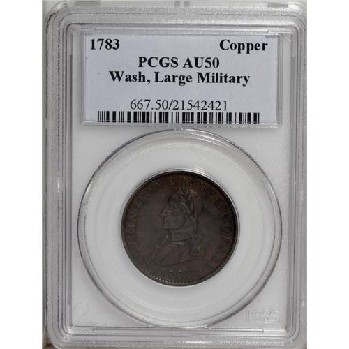 <B>1783 1C Washington & Independence Cent, Large Military Bust AU50 PCGS.</B></I> Baker-4, R.1. Nicely struck with hints of red and orange on the violet-brown surfaces, which display minor wear. Listed on page 75 of the 2007 <I>Guide Book.</B></I><BR><BR><b>Shipping:</b> Coin/Currency (<a target="_blank" href="http://www.heritageauctions.com/common/shipping.php">view shipping information</a>)