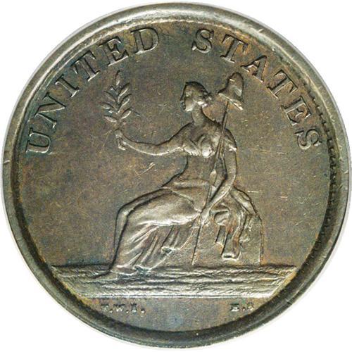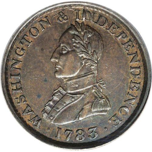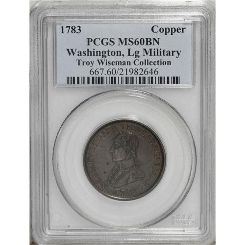 <B>1783 1C Washington & Independence Cent, Large Military Bust MS60 Brown PCGS.</B></I> Baker-4, R.1. Chocolate-brown toning dominates the obverse, with lighter color across the peripheral legend. The reverse displays rich olive-brown toning. A heavy vertical crack through the upright of N3 distinguishes this die pairing and state, and two lighter arc-shaped cracks journey from each side of the bust through the legends. The dies have close to medal turn, uncommon for the type. Listed on page 75 of the 2007 <I>Guide Book.</B></I><BR><I>From The Troy Wiseman Collection, Part Two.</B></I><BR><BR><b>Shipping:</b> Coin/Currency (<a target="_blank" href="http://www.heritageauctions.com/common/shipping.php">view shipping information</a>)