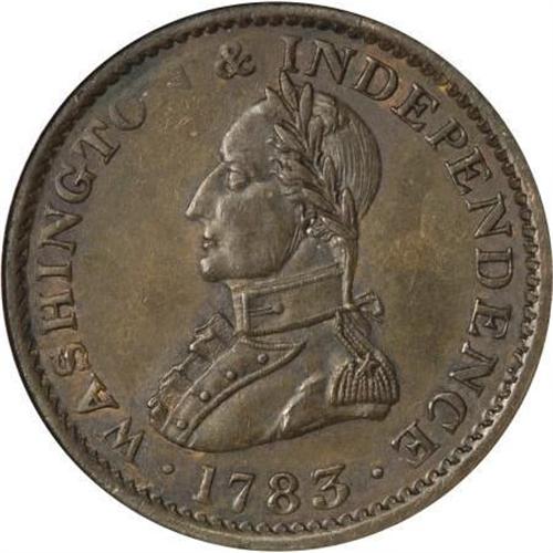 <B>1783 1C Washington & Independence Cent, Large Military Bust MS62 Brown NGC.</B></I> Baker-4, R.1. A deep brown Washington piece with ample satin luster and unmarked surfaces. Boldly struck aside from the N in WASHINGTON and opposite on the left border of the seated effigy's platform. Listed on page 75 of the 2008 Guide Book. Census: 5 in 62 Brown, 0 finer (12/07).<BR><I>From The Liberty Collection of United States Colonial Coinage.</B></I><BR><BR><b>Shipping:</b> Coins & Currency (<a target="_blank" href="http://www.heritageauctions.com/common/shipping.php">view shipping information</a>)