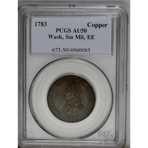 <B>1783 1C Washington & Independence Cent, Small Military Bust, Engrailed Edge AU50 PCGS.</B></I> Baker-4B, R.3. The Engrailed Edge is the scarcer of the two edge variations for the Small Military Bust type. Presumably, the Engrailed Edge pieces were struck after their Plain Edge counterparts, since the obverse die exhibits many cracks. A smooth medium-brown example with pleasing surfaces. Listed on page 75 of the 2007 <I>Guide Book.</B></I><BR><I>From The Jones Beach Collection.</B></I><BR><BR><b>Shipping:</b> Coin/Currency (<a target="_blank" href="http://www.heritageauctions.com/common/shipping.php">view shipping information</a>)