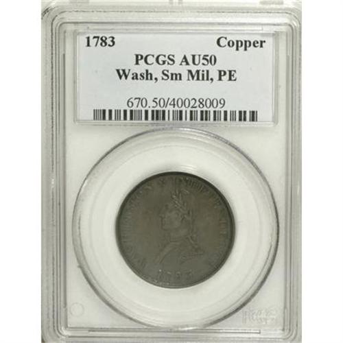 <B>1783 1C Washington & Independence Cent, Small Military Bust, Plain Edge AU50 PCGS.</B></I> Baker-4A, R.2. A deep brown Washington piece that has moderate highpoint wear and a concealed thin vertical mark on the left reverse field. Listed on page 75 of the 2008 <I>Guide Book.</B></I> Population: 8 in 50, 13 finer (8/07).<BR><BR><b>Shipping:</b> Coins & Currency (<a target="_blank" href="http://www.heritageauctions.com/common/shipping.php">view shipping information</a>)
