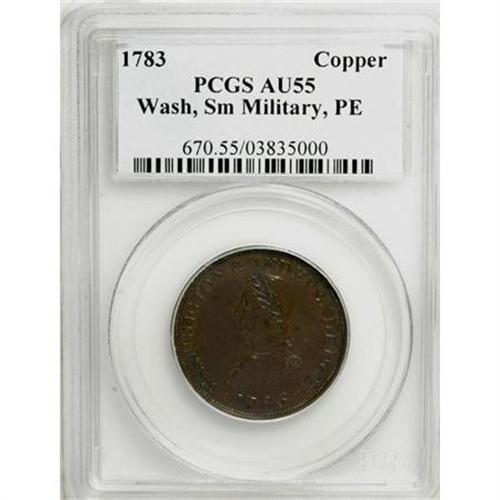 <B>1783 1C Washington & Independence Cent, Small Military Bust, Plain Edge AU55 PCGS.</B></I> Baker-4A, R.2. This dark brown Choice AU Washington cent has minimal wear, and is smooth save for faint hair-thin marks on the upper right reverse. Scarcer than its Large Military Bust counterpart. Listed on page 75 of the 2008 <I>Guide Book</B></I>. Population: 5 in 55, 5 finer (12/07).<BR><BR><b>Shipping:</b> Coins & Currency (<a target="_blank" href="http://www.heritageauctions.com/common/shipping.php">view shipping information</a>)