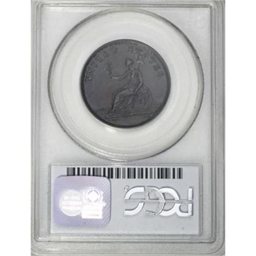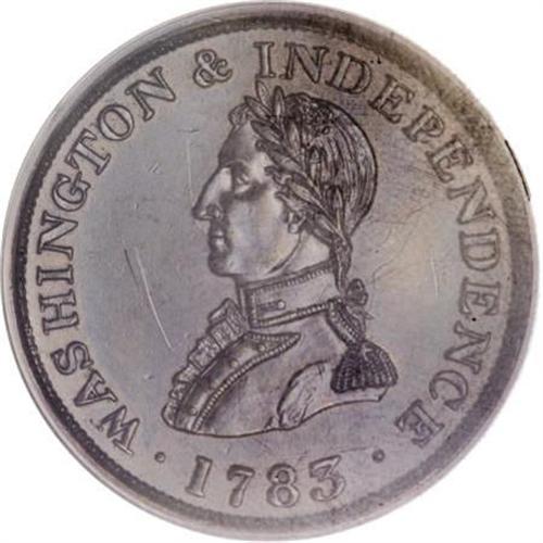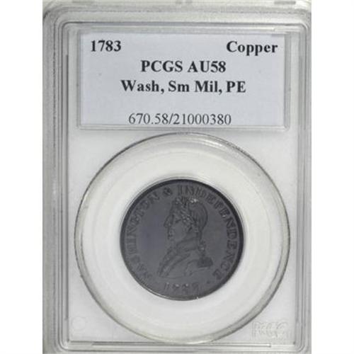 <B>1783 1C Washington & Independence Cent, Small Military Bust, Plain Edge AU58 PCGS.</B></I> Baker-4A, R.2. Slight friction is present on Washington's laurel wreath and on the legs of the seated effigy, but this sharply impressed example retains most of its mint gloss. Deep mahogany toning with olive and rose undertones. A pair of thin marks on the left obverse field merit mention. Struck from prominently clashed dies. Listed on page 75 of the 2008 <I>Guide Book</B></I>. Population: 4 in 58, 1 finer (12/07).<BR><I>From The Liberty Collection of United States Colonial Coinage, Part Two.</B></I><BR><BR><b>Shipping:</b> Coins & Currency (<a target="_blank" href="http://www.heritageauctions.com/common/shipping.php">view shipping information</a>)