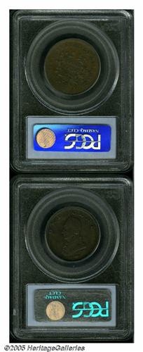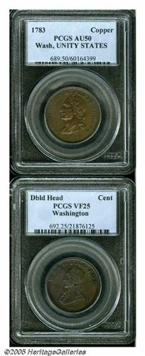 <B>1783<1C> Washington Unity States Cent AU50 PCGS,</B></I> Baker-1, R.1, a pleasing and lightly circulated chocolate-brown piece with the usual peripheral roller marks, as made; and an <B>Undated Washington Double Head Cent VF25 PCGS,</B></I> Baker-6, R.1, bold for the grade, perhaps lightly cleaned in the past, a couple of handling marks on the 'reverse' field. Listed on page 65 of the 2005 <I>Guide Book.</B></I>