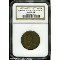 1783 1C Washington Unity States Cent AU58 NGC. Bak <B>1783 1C Washington Unity States Cent AU58 NGC.</B></I> Baker-1, R.1. A lightly circulated golden-brown representative with a short pinscratch near 7 o'clock on the reverse. The borders exhibit moderate roller marks, as usual for the issue. Listed on page 65 of the 2005 <I>Guide Book.</B></I> <BR><BR><B>Important notice:</B> Heritage usually auctions material at the rate of 200-250 lots per hour. On some occasions eBay Live bid software or the Internet may not be able to keep up with the pace of the auction. We recommend placing a realistic absentee bid now as insurance to avoid disappointment. Occasionally the auctioneer may eliminate or reject an eBay Live bid, and the auctioneer may also reopen a lot after the close of the eBay live bidding (usually because we missed an audience bid), and may reject your bid even if it shows you as the winning bidder. By bidding via eBay Live, you agree that Heritage may award the lot to another bidder at its sole discretion under the circumstances described above or any other reasonable circumstances. Since eBay bids are not shown to us until we open the lot on the floor, we treat those bids just like floor bids. In most cases the floor responds before the eBay bid is presented to us, due to Internet lag time, so for consistency we have made it a policy that floor bids are always considered first over tie eBay live bids. Also please note that all Heritage lots purchased through eBay Live carry a 20% Buyer's Premium. Please make sure you read the Terms and Conditions before you bid. This lot is being auctioned in conjunction with a live floor auction by Heritage Galleries & Auctioneers. All final auction and invoice information will be supplied by Heritage Galleries & Auctioneers, and all other information should be considered preliminary. Lot:5007