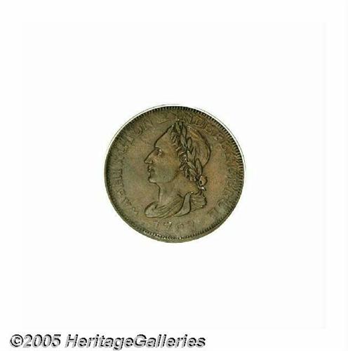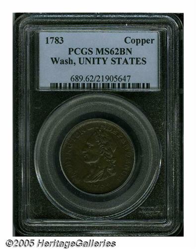 <B>1783<1C> Washington Unity States Cent MS62 Brown PCGS.</B></I> Baker-1, R.1. A pleasing mahogany-brown Washington piece. The borders display the mint-made roller marks that are endemic for the issue, but the peripheral legends are clear, and the fields are uncommonly smooth. Despite the 1783 date, the reverse design imitates the Large Cent of the 1793 to 1807 era. Listed on page 65 of the 2005 <I>Guide Book.</B></I> Population: 5 in 62, 3 finer (6/05).