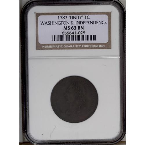 <B>1783<1C> Washington Unity States Cent MS63 Brown NGC.</B></I> Baker-1, R.1. The reddish medium-brown surfaces are faintly granular, and moderate roller marks, characteristic of the variety, accompany the reverse periphery. A high grade for this popular Early American Washington piece. Listed on page 76 of the 2007 <I>Guide Book.</B></I>
