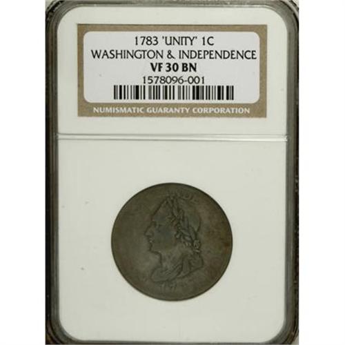 <B>1783 1C Washington Unity States Cent VF30 NGC.</B></I> NGC Census: (0/0). PCGS Population (19/207). (#689)<BR><BR><b>Shipping:</b> Coins & Currency (<a target="_blank" href="http://www.heritageauctions.com/common/shipping.php">view shipping information</a>)