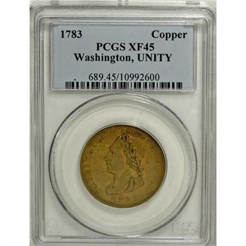 <B>1783 1C Washington Unity States Cent XF45 PCGS.</B></I> Baker-1. The deep walnut-brown surfaces show faint skeins of orange in the obverse fields. Lightly circulated with strong central detail and great visual appeal, though the peripheral elements show softness. Listed on page 76 of the 2008 <I>Guide Book</B></I>.<BR><I>From The Beau Clerc Collection.</B></I><BR><BR><b>Shipping:</b> Coins & Currency (<a target="_blank" href="http://www.heritageauctions.com/common/shipping.php">view shipping information</a>)