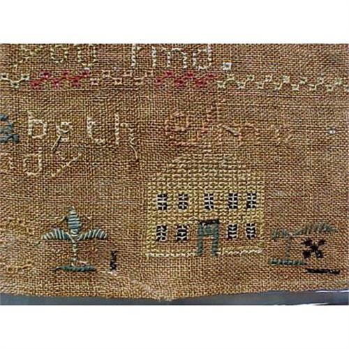Antique American sampler needlework textile, dated 1783, signed Elizabeth Ann Cochran, Peabody Ma. 18th C. American samplers are rare, especially those that can be so well identified. This one appears to be the work of a very young girl, perhaps age 7-10, born 1783. Some of the [ s ] are written like [ f ], as they were in the 18th C. Long, narrow unbleached linens like this were frequently used for vertical 17th and early 18th C. needlework but not usually seen afterwards, another rare feature of this sampler. Stitching includes satin, eyelet, feather, chain, as well as cross stitch. Much of it is worked with a single strand of thread, some with multiple strand. Colors: peach, cream, teal blue, black, brown, and bright red (digital camera causes the red to appear to be running -- it is NOT). Unbleached linen color is like medium walnut. In the horizontal rows of stitching there are some missing threads (perhaps eaten by a long-dead cloth mite found in a fold). Somehow the piece sustained two small slits at the bottom edge which had been scotch-taped on back. But it has no holes, no alterations, no repairs, creases not yet ironed out. 8-1/2W x 23-1/2L inches. Frame is 1890 oak molding, put on after sampler turned up folded in storage.